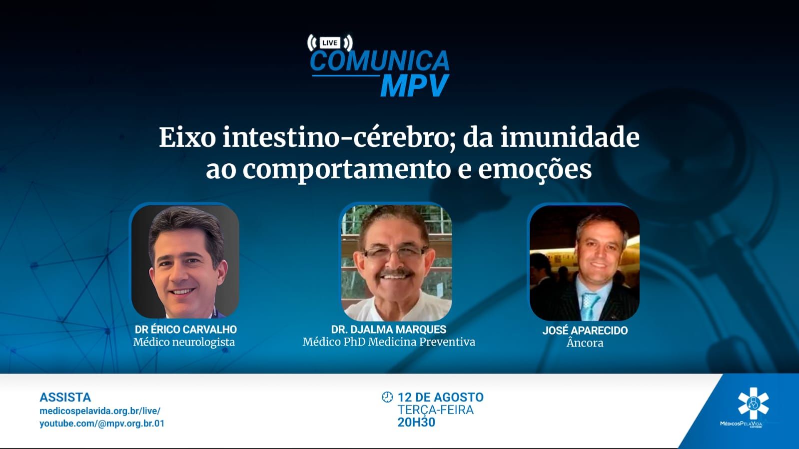 O Médicos pela Vida recebe nesta 166ª Live Comunica MPV, de terça-feira (12/08) às 20h30, o Dr. Erico Carvalho, neurologista. Ele vai falar sobre o “Eixo Intestino-Cérebro; da imunidade ao comportamento e as emoções”.