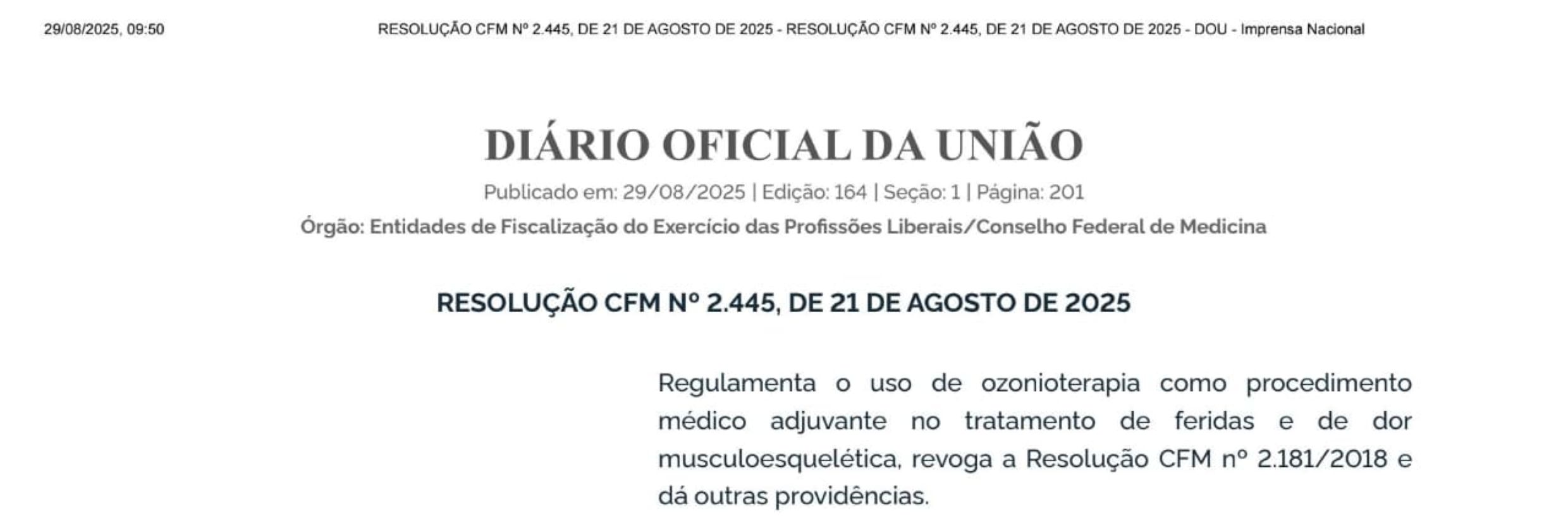 Na última quinta-feira, 28 de agosto de 2025, o Conselho Federal de Medicina (CFM) divulgou a Resolução nº 2.445/2025,de 21 de agosto, que foi publicada nesta sexta-feira (29/8) reconhecendo oficialmente, e regulamentando a ozonioterapia como prática médica no Brasil.