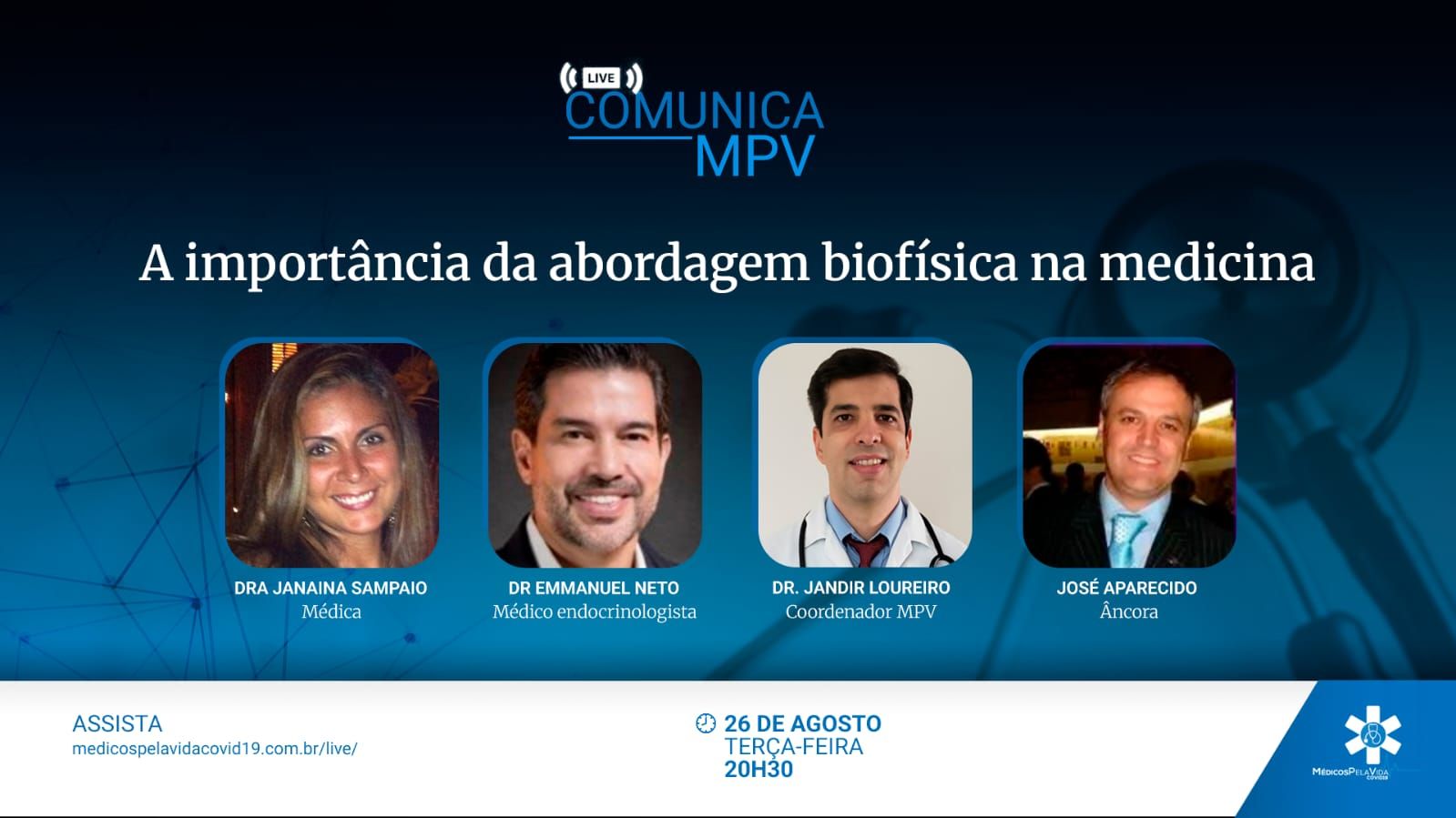 O Médicos pela Vida recebe nesta 168ª Live Comunica MPV, vai falar da importância da abordagem biofísica da medicina – Terça-feira (26/9) às 20h30 recebendo a Dra Janaina Sampaio e o Dr Emmanuel Neto, com a coordenação: Dr. Jandir Loureiro.